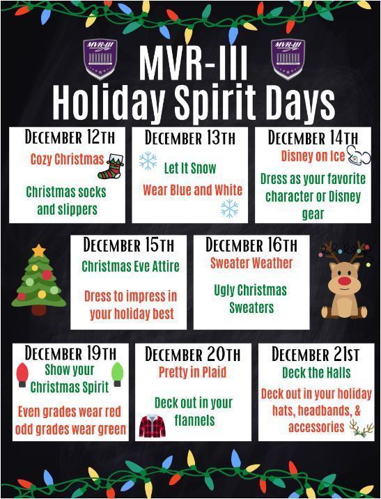 Get in the holiday spirit and participate in MVR-III Holiday Spirit Days! Spirit Days start on Monday, December 12th with the theme of "Cozy Christmas"! See the flyer below for more details on the holiday fun!
